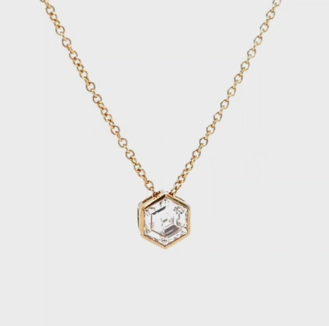 Showcases a single hexagon-cut lab-grown diamond in a minimalist bezel setting, the Rayon de Miel Solitaire Pendant draws the eye with refined clarity. Offered in a choice of 0.30ct, 0.50ct, and 1ct sizes, it allows you to select the perfect balance of subtle elegance or statement sparkle, tailored to your personal style or the occasion.